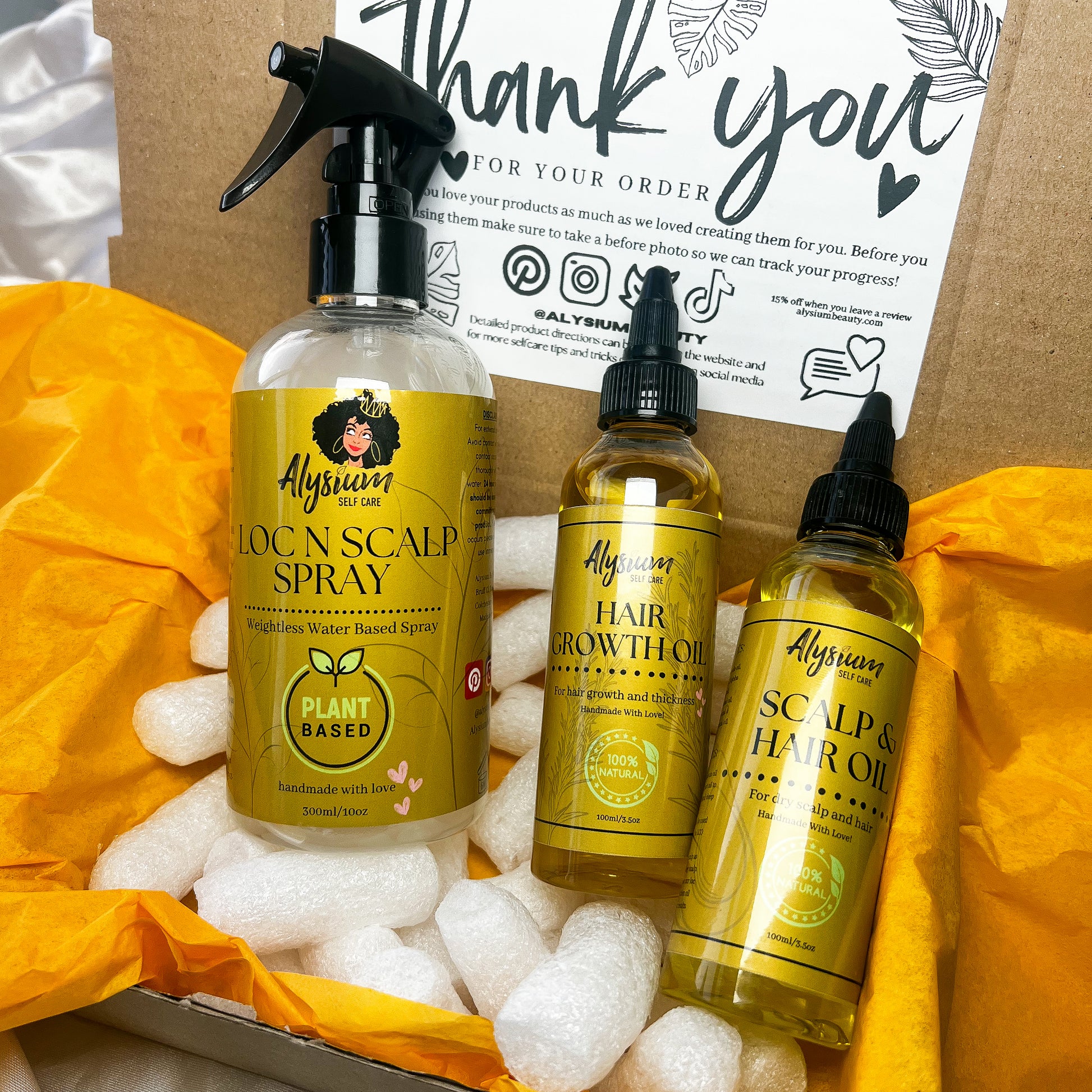 This comprehensive bundle includes all three products: Hair Growth Oil, Hair & Scalp Oil and Loc Spray. It’s the perfect all-in-one routine for anyone looking to support healthy growth, soothe scalp issues and keep their locs hydrated and nourished. The Hair Growth Oil promotes growth and thickens locs, the Hair & Scalp Oil soothes the scalp and the Loc Spray hydrates and adds shine. This bundle provides a well-rounded approach to maintaining healthy locs.